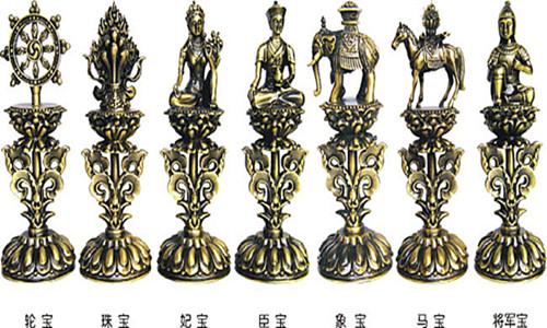 7.將軍寶:又稱兵寶、武士寶。為一持兵器的武士形像,表示護持佛法、克服困難、戰(zhàn)勝敵人。